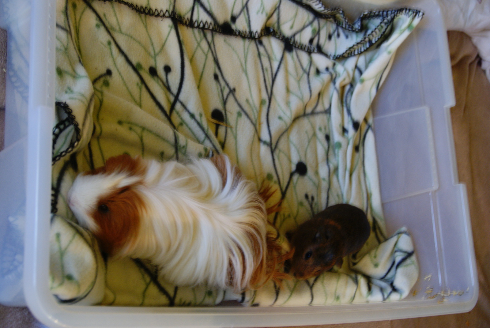 O včerejška spolu bydlí Glorie a Paľko :-). Musela jsem trochu překopat plány, protože malé potvůrky Glorii okousaly ... :/. Celou dobu se tvářily v pohodě a včera, když jsem šla morčátka krmit, málem jsem dostala infarkt... Pomalu ani jeden chlup nenechaly dlouhý :(. Takže na výstavu to teď rozhodně není. Proto jsem se rozhodla dát ji s Paľkem ;-).